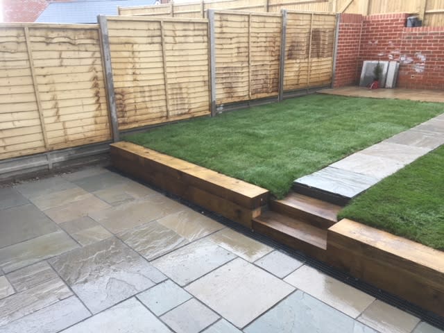 “We top soiled and turfed the top level of the garden. Then we laid down grey Indian Sandstone for the new patio and path. Lastly, we built a wall with sleepers and installed drains to tackle the problem of surface water.”
